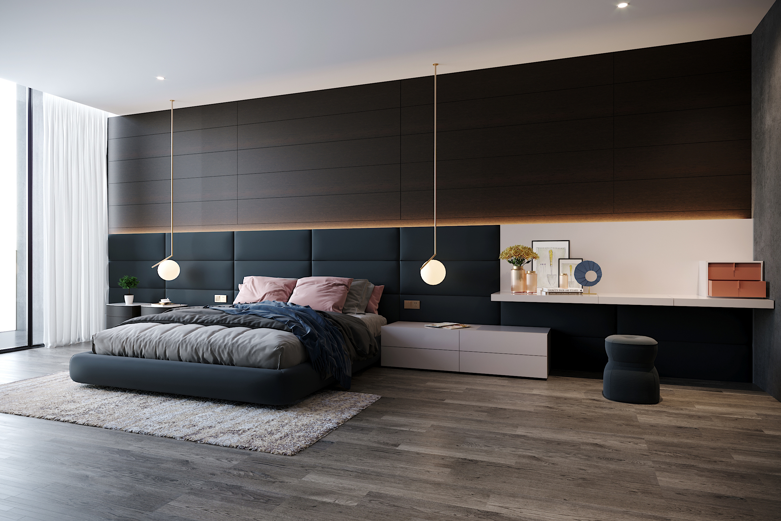 气质感复古蓝调的一体式皮质软包床靠,沉稳迷人的烟熏橡木做背景底色,加上科技感十足的线性灯光,让空洞的墙体变得耐人寻味。