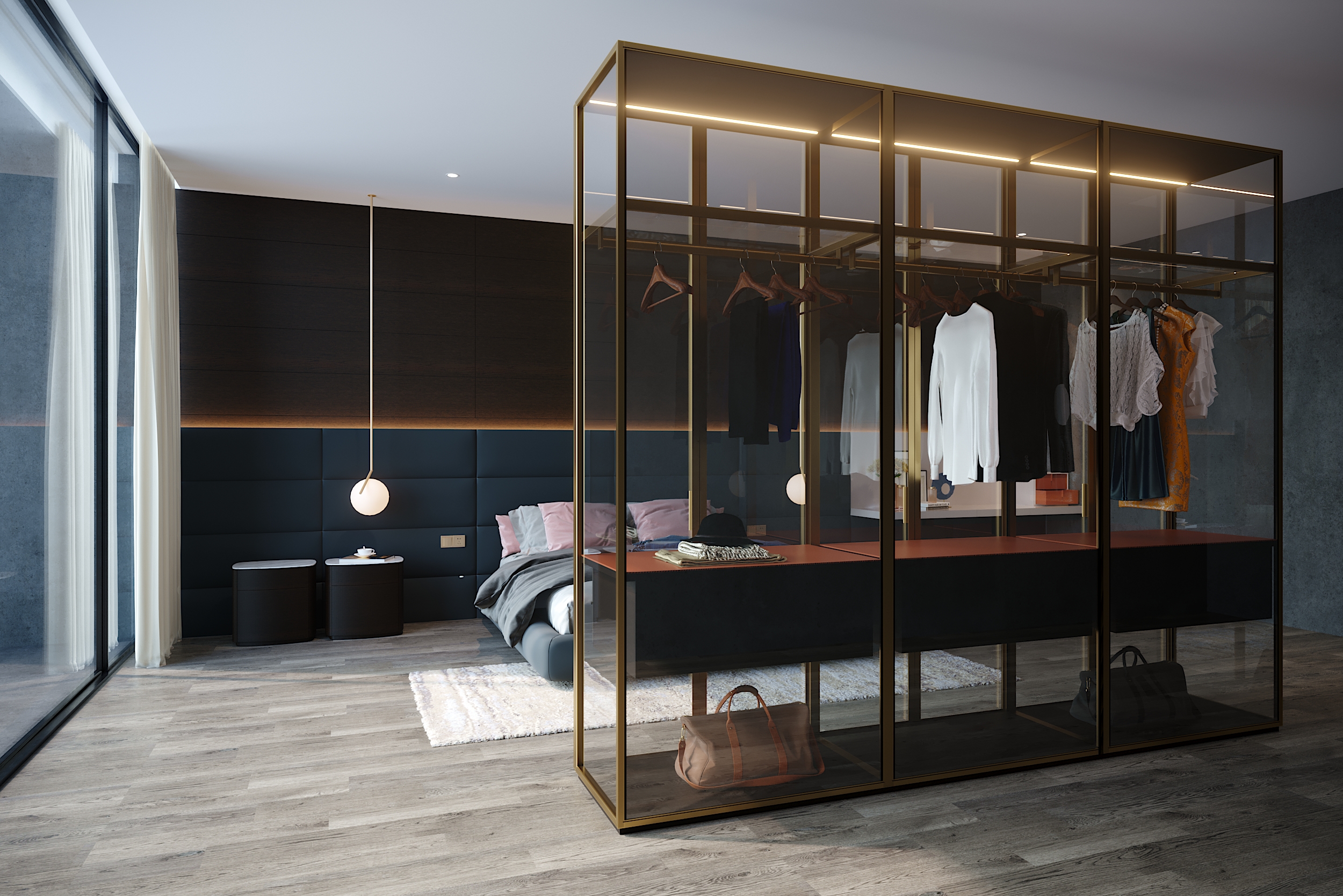 依墙而生的一字悬空梳妆台,简洁雅致,更最大化的利用卧室的小角落,避免卫生死角,让休息区更为干净整洁。全玻璃古铜金铝框衣柜,既是隔断也能作展示收纳,高级又耳目一新。