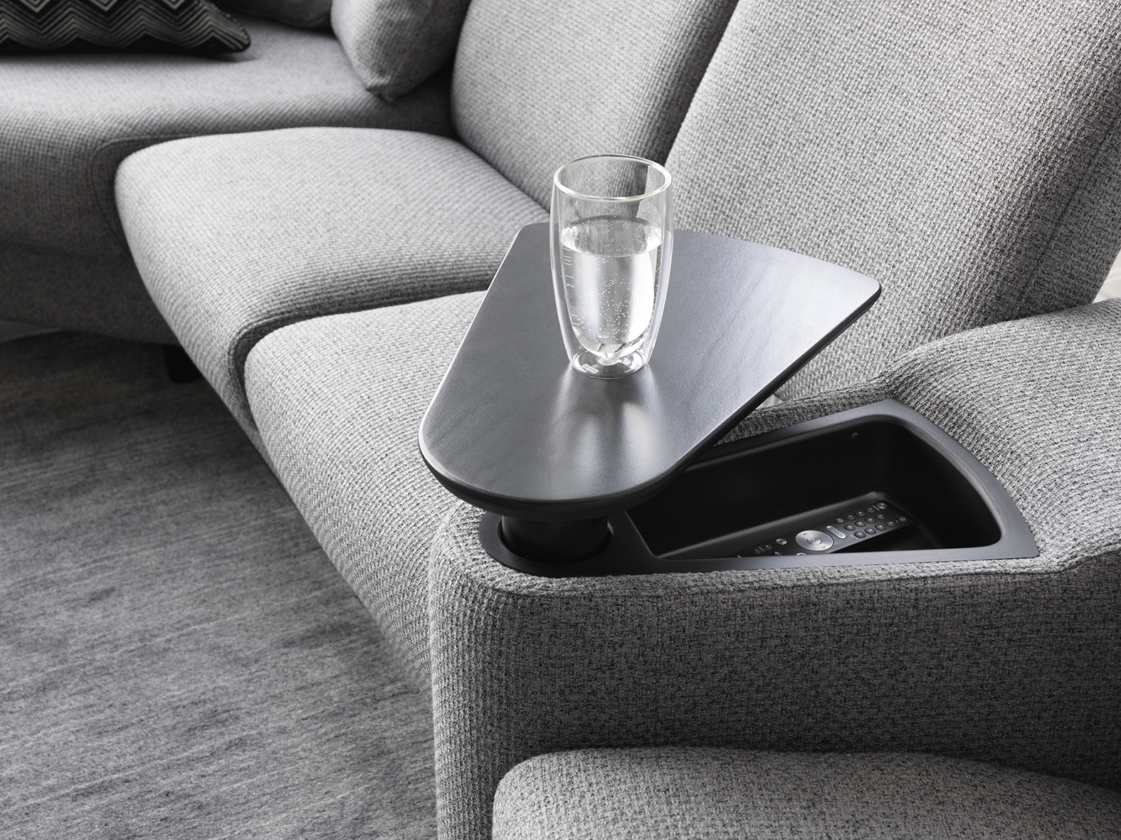 顶端藏有可旋转而出的木质台面,不仅添加了储物、置物等实用功能,更给使用者带来如在影院观看大片般的奇妙感受。